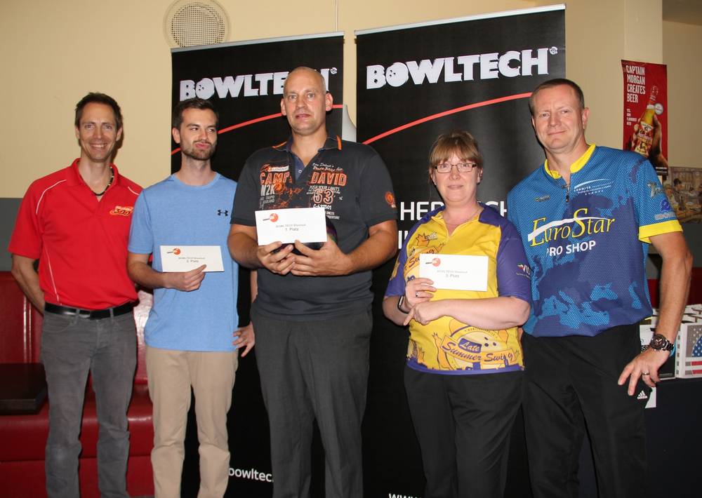 Die Gewinner mit Jens Scheinert (BOWLTECH) links und Marco Platzbecker (Pro Shop, Berlin) rechts im Bild
